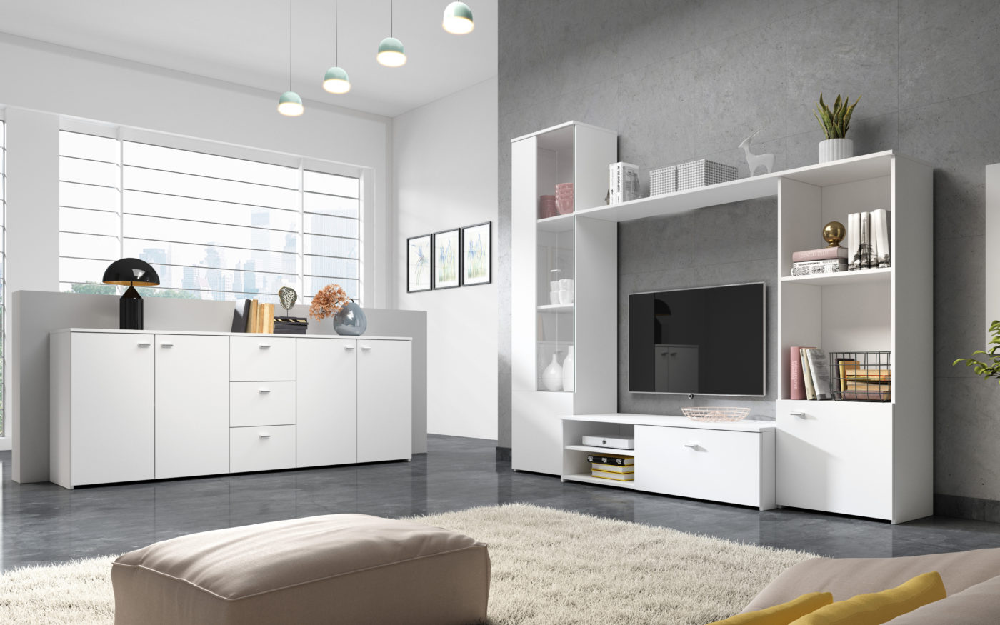 Meble zostały wykonane z wytrzymałej płyty laminowanej z obrzeżami ABS, odpornej na zarysowania, uszkodzenia, wysoką temperaturę i wilgoć, dzięki temu sprawdzą się w nowoczesnym salonie.