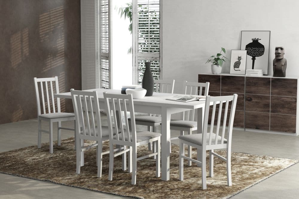 Istnieje możliwość wykonania zestawu w wybranym kolorze drewna oraz w wielu rodzajach tkanin tapicerskich do wyboru z próbników zamieszczonych na stronie sklepu
